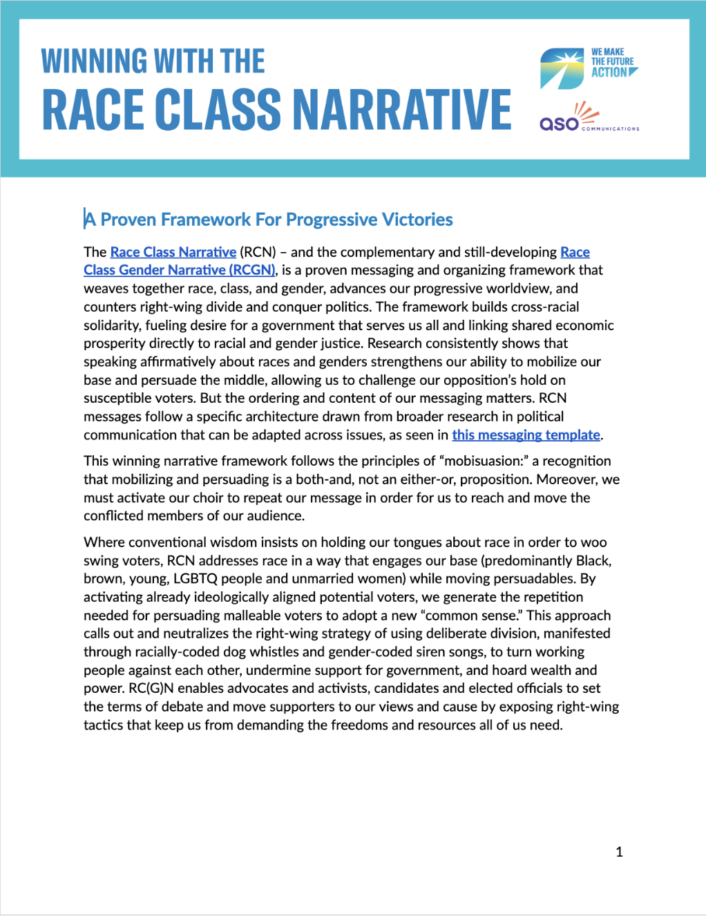 The Race Class Narrative (RCN) – and the complementary and still-developing Race Class Gender Narrative (RCGN), is a proven messaging and organizing framework that weaves together race, class, and gender, advances our progressive worldview, and counters right-wing divide and conquer politics. The framework builds cross-racial solidarity, fueling desire for a government that serves us all and linking shared economic prosperity directly to racial and gender justice. Research consistently shows that speaking affirmatively about races and genders strengthens our ability to mobilize our base and persuade the middle, allowing us to challenge our opposition’s hold on susceptible voters.